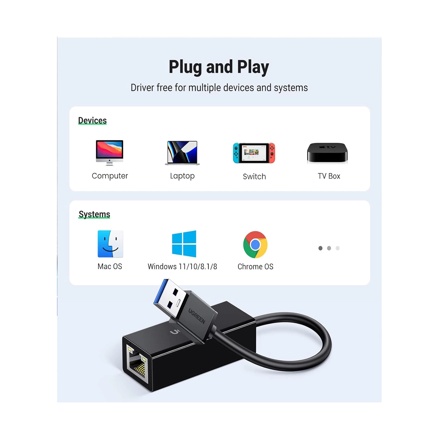 به لطف رابط USB 3.0، پهنایباند کافی برای رسیدن به سرعت گیگابیتی فراهم است و در عین حال با USB 2.0 نیز سازگار میماند. نصب آن کاملاً Plug & Play است و روی اکثر سیستمعاملها بدون نیاز به درایور اضافی کار میکند. کافی است آن را به پورت USB متصل کنید تا شبکه فوراً فعال شود.