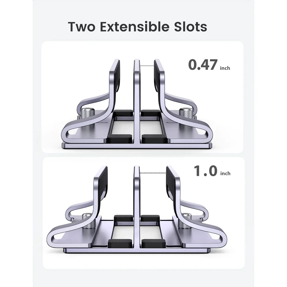 وجود پیچ تنظیم عرض باعث میشود بتوانید فاصله هر شیار را متناسب با ضخامت دستگاه خود تنظیم کنید. این استند با لپتاپها و تبلتهایی با ضخامت بین 12 تا 26 میلیمتر و اندازه نمایشگر تا 15.6 اینچ سازگار است. بنابراین اکثر مکبوکها، اولترابوکها و لپتاپهای ویندوزی مدرن بدون مشکل در آن قرار میگیرند.